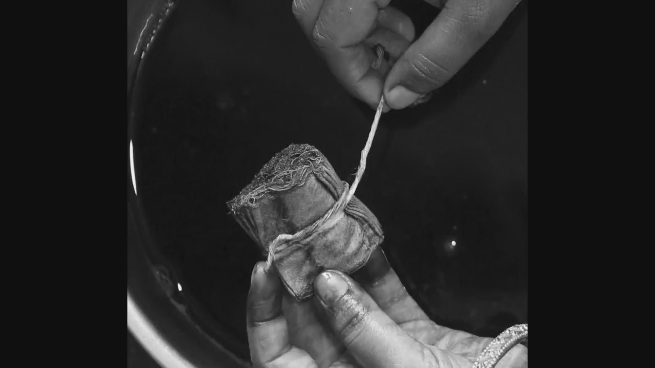 Hand tie-dyed using light grey tones derived from natural cedar, this cotton ribbon set includes 6 soft, frayed-edge ribbons. Crafted slowly in small batches by skilled artisans in Jaipur, each ribbon holds subtle differences in color and texture — celebrating the beauty of imperfection and the meditative rhythm of handwork.